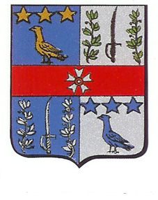 Part : d'azur et d'argent, à la fasce brochante de gueules, chargée du signe des chevaliers légionnaires et accompagnée en chef à dextre d'un pigeon surmonté de trois étoiles rangées en fasce, le tout d'or et, à senestre, d'un sabre en pal de sable accosté de deux branches de laurier, le tout d'argentet, à senestre, d'un pigeon d'azur surmonté de trois étoiles du même, rangées en fasce.
