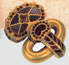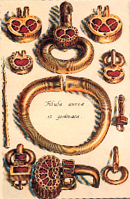 Plaque-boucle, or, plaque cloisonnée de grenats taillés en table.provenant de la nécropole princière d'Apahida (Transsylvanie), Musée national de Bucarest. |