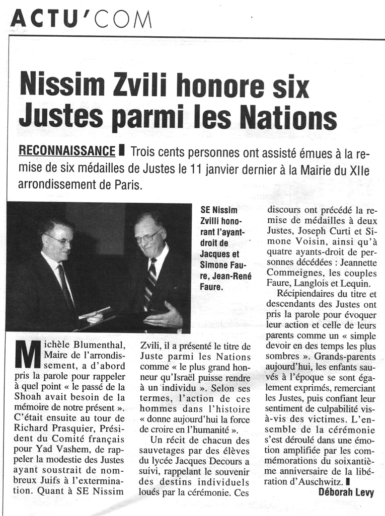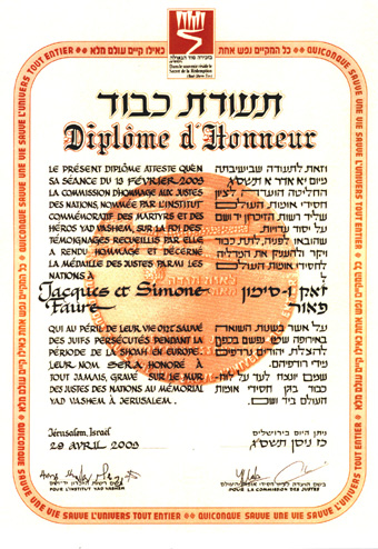 Les deux familles ont maintenu leurs liens d'amitié après la guerre. Madame Simone Faure et son mari le général Jacques Faure sont décédés. C'est leur fils aîné Jean René Faure, qui a reçu en leur nom, la Médaille des "Justes parmi les Nations".